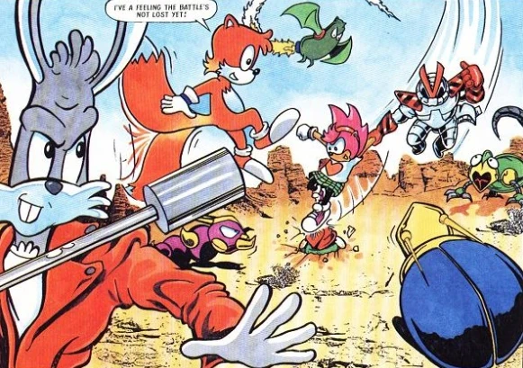 Since Sonic became stranded in the Special Zone, the Freedom Fighters are struggling, but continuing to resist Robotnik. On this occasion, they are outnumbered by Badniks. Things take a turn for the worst when Tails is knocked out of the sky, and Amy is swept up by a Balkiry when she goes to make sure Tails is okay. Johnny hurls his staff at the Badnik, but misses, and Tails is still too woozy to go after them. As Johnny and Tails are surrounded by the remaining Badniks, the Balkiry holding Amy is shot down by an unseen laser blast. As Amy plummets to the ground, her rescuer is revealed to be Shortfuse the Cybernik, who wastes no time in launching into his backstory. Shortfuse and Amy rejoin the battle on the ground, and make short work of the Badniks. As the heroes recuperate after their battle, Amy offers Shortfuse a place on the team, which he declines. Tails and Johnny respond that Robotnik will show them no mercy since Sonic's not around, which convinces the loner Cybernik to join them. The heroes strike a dramatic pose as Shorty vows he'll join the Freedom Fighters for as long as it takes to bring Robotnik down, even if he can't fill Sonic's shoes.
