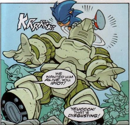 Chaos is hit by Sonic's Spin Attack, which causes Sonic to become stuck in him and turns his eyes green.