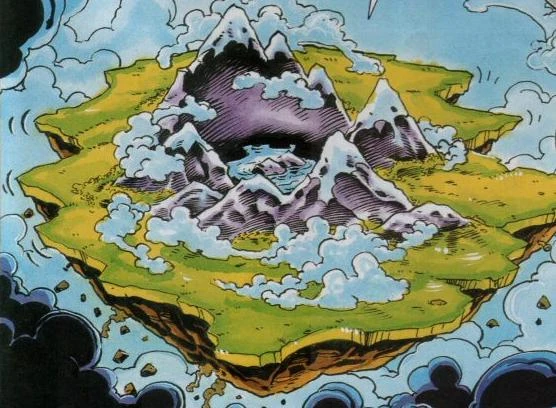 The Floating Island is a large landmass that hangs in the skies above Mobius. How it originally came to be that way has never been revealed, but it is kept aloft by the power of the Chaos Emeralds. The Floating Island was once the home of the ancient Echidna race and is protected by the last member of that race - Knuckles the Echidna. The island first appeared in Sonic the Summer Special.