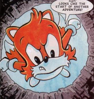 The adventure takes place in the Spring Flower Zone, where Tails' walk is interrupted by a Buzzer Badnik attack. Although initially unsure of how easy the upcoming fight would be, Tails quickly dispatches of one enemy and lets the other two collide into each other. Ready to continue his walk, he is disturbed by a loud wail and turns to see a crying mouse, one of the Badnik captives. Tails offers to take him home, but the boy, revealed to be called 'Tristram' (but called Tantrum due to his constant wailing), is from the Metropolis Zone. Tails is reluctant, but he "promised". As he turns to fly Tantrum away, a bullet flies past the pair and bounty hunter Fleabyte is ready to kill them for a hefty reward from Doctor Robotnik. As Fleabyte shoots, he finds his gun won't work, so Tails and Tantrum escape, only for Fleabyte to have a more powerful gun. As they flee, Tantrum falls down a pothole and Tails has no choice but to go after him.
