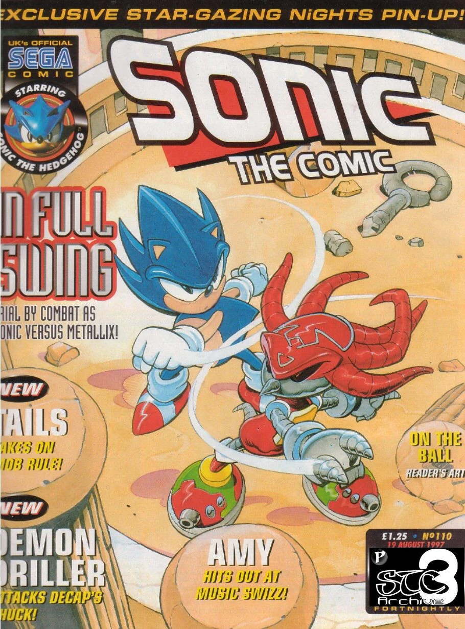 Issue 110 is the one hundred and tenth edition of Sonic the Comic, the UK's official SEGA comic. Released on the 6th August 1997, at the price of £1.25, the issue contained four original stories, two of them new, as well as several features and a pin-up of Elliot from NiGHTS.