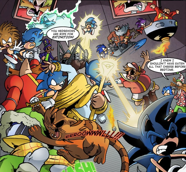 9 incarnations of Doctor Robotnik (and a very confused Doctor Kintobor) have been pulled from the dictator's past and future to battle Sonic. The hedgehog is confident enough to take them all on, but after having Robotnik's ghost plunge through him, he is shocked into exhaustion by a future Robotnik who has been heavily augmented with robotic parts. None of the Robotniks know who has brought them together however, and Sonic theorises that it is down to the one in the present day. Sonic soon finds a number of his own previous incarnations (and Bravehog) battling several traps and Badniks. The other Robotniks quickly arrive, and soon both sides are locked in battle. Ultimately, one of the Robotniks, a magician version, summons the cause of the chaos.