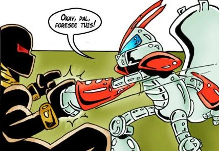 Tekno is furious and asks what's going on, the Slave revealing he does his master's bidding. Inside the house that Shortfuse crashed into, the squirrel is currently out of action. While he is, an unsavoury figure approaches, vying to do the next part of his plan himself. Outside, Tekno realises brute force won't work on the slave, so resorts to insulting the monster. Irritated, the slave charges forward, allowing Tekno to stab him with a tazer. The slave is soon summoned back by his master and escapes through a portal before Tekno can stop him. Shorty arrives soon after, berating Tekno for the bugs that his armour has. Tekno is equally snarky, telling Shorty he shouldn't have charged in. The heroes walk each other home, aware that there will be plenty more adventures ahead.