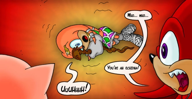 Tikal is absolutely hysterical, waving her staff wildly at Knuckles. Porker reveals that she was somehow brought into the future, trapped inside the Chaos creature. For eight millennia she was forced to live with a monster that inspires total fear, driving Tikal insane. Now, her memories returning, she is slowly dying from the weight of the memories. Fortunately, Ebony is here and she has a plan. Her solution is wipe her memories, allowing Tikal to forget her time with Chaos. Ebony can't pick and choose which memories to keep, however, meaning she'll forget all about the ancient past as well. Knuckles is furious, not willing to let his only link to his past be removed. In desperation, he punches Ebony and goes to assist Tikal. He doesn't prove to be very comforting and Tikal falls further into her fearful madness. As Knuckles ponders what he should do about Tikal's suffering, his answer is given to him by Ebony, blasting him into a wall. Within seconds, her spell is complete, Tikal lying peacefully on the floor. Knuckles is crestfallen; Ebony tries to talk to him, but leaves soon after, knowing it's hopeless.