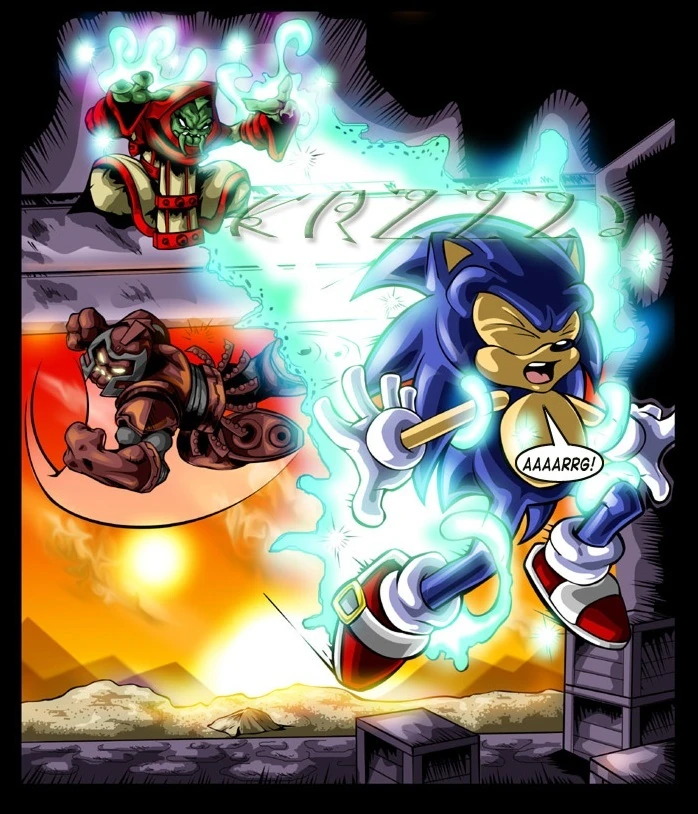Sonic has used the Mobius Ring on Flickies' Island to travel to the planet Drak, thinking the Drakons, having discovered Chaos energy, can somehow help him deal with the Syndicate's Chaos Siphon, though he isn't happy about the idea. He soon finds himself being mobbed by a number of locals, revealed to be fans of his since he won his trial by combat. Sonic doesn't feel like giving Journalist Scribe 2020 an interview and demands to see Emperor Ko-Dorr, who he learns has long since been replaced by one Emperor Brokken. Suddenly, a group of Sentinels appear, but Sonic quickly leaps onto the back of one, demanding to see whoever's in charge. He is swiftly taken to the House of Knowledge, where he is quickly restrained and brought before Master Scholar and Sister Haggra. Haggra thinks Sonic is here to lead the Drakons to the Chaos Emeralds, as a prophecy has foretold, but Scholar allows Sonic to speak first. Sonic gives the Drakons his reasons for coming, and knows full well why the Drakons should help him: He knows the Drakons want the Emeralds, and if Mobius is destroyed, they can't have them. Master Scholar agrees, and thus orders that Sonic be supplied with a Chaos Tap and Drakon sword to operate a Mobius Ring. After learning what the Tap does, and that he is now in the Drakons' debt, Sonic quickly returns home, leaving Scholar and Haggra to discuss Scholar's plan. They can deactivate the Chaos Tap at any time, destroying Mobius, and when they launch a new invasion, the Mobians will be unable to stop them as a result, thus giving them a chance to raid the Floating Island's emerald mine and create thousands of new Chaos Emeralds. Scholar then gives Delta Scholar instructions to tell Rouge, his spy on Mobius, to pull out of her operation but keep an eye on Doctor Zachary. Meanwhile, Sonic has planted the Chaos Tap, and sets off through the Mobius Ring again to finish things with Shadow and the Syndicate...