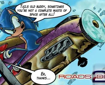 Throughout Sonic the Comic, Tails has piloted his own bi-plane. It is painted red with a white stripe across each side, with the word 'Sonic' emblazoned on the tail. The plane has no weaponry and is only used for transport. Sonic often rides standing on the top wing. On occasion, the plane has been seen to have two seats, since Johnny Lightfoot piloted it with Amy Rose as passenger. Four people have once squashed into it, with Tails transporting Knuckles the Echidna, Porker Lewis and Amy from the falling Floating Island. Towards the end of Sonic the Comic, the plane was replaced by a purple design, similar to the Tornado 2 from Sonic Adventure. This plane has been continuously used by Tails in Sonic the Comic Online.