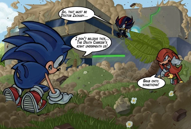 Trapped in a flying capsule above the Emerald Ocean, Sonic tries to work out an escape plan so he can put a stop to the Syndicate's plan to blow Mobius up. Right on cue, Tails arrives in the bi-plane, breaking Sonic out, and they set off for Flickies' Island, where something isn't right. On the Death Carrier, Doctor Zachary explains his plan to Rouge, when Shadow steps in with news. Knuckles has arrived on Flickies' Island looking for the Chaos Emeralds. Just when he should be right on top of them, Shadow appears to confront the echidna. He gives Knuckles a hard time, but is quickly attacked by a blue streak: Sonic has arrived, and immediately begins fighting Shadow again. Suddenly the Death Carrier bursts out of the ground beneath the fighters. Sonic is unable to grab onto the ship and is left on the island as Tails gives chase in the bi-plane, assuming the hedgehog is aboard. Now alone, Sonic realises what he has to do as the Syndicate begin charging the Chaos Siphon, unaware that Knuckles is hanging onto the ship's exterior....